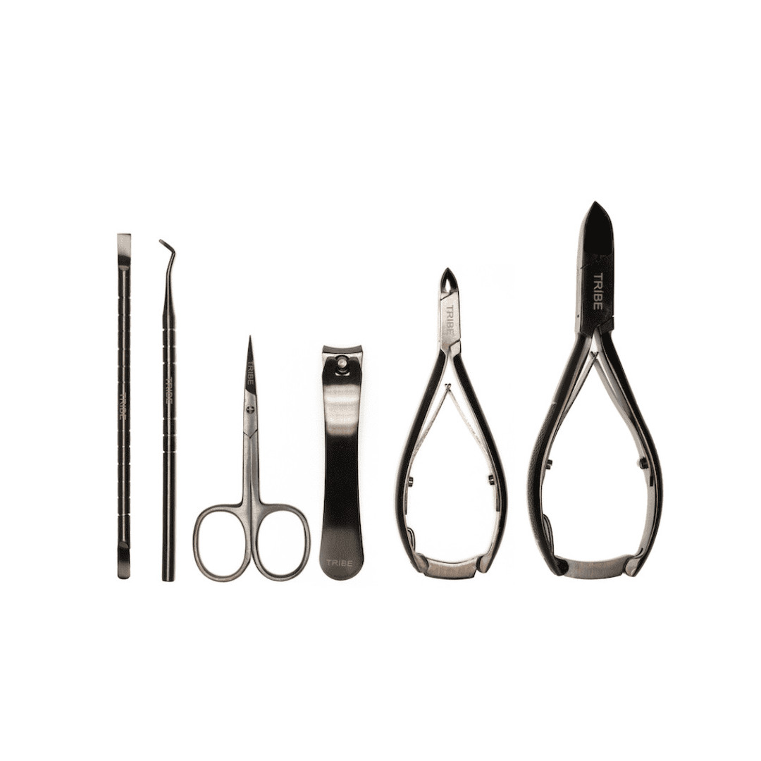 Black handcrafted stainless steel TRIBE professional Nail Tool Kit with a protective titanium coating that increases tool life, prevents rusting and forms a barrier against bacteria providing stellar hygiene standards and safety for both you and your client.